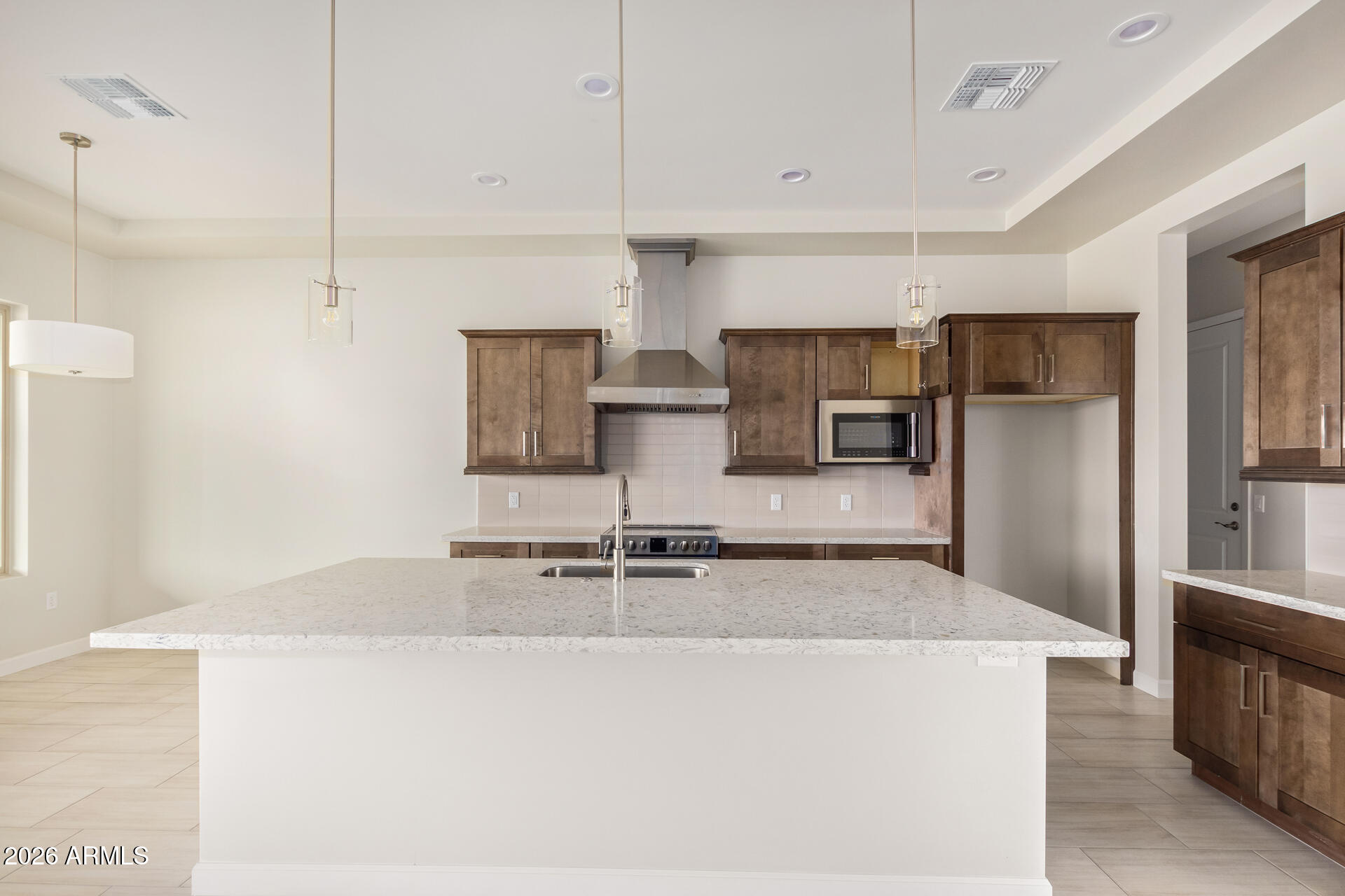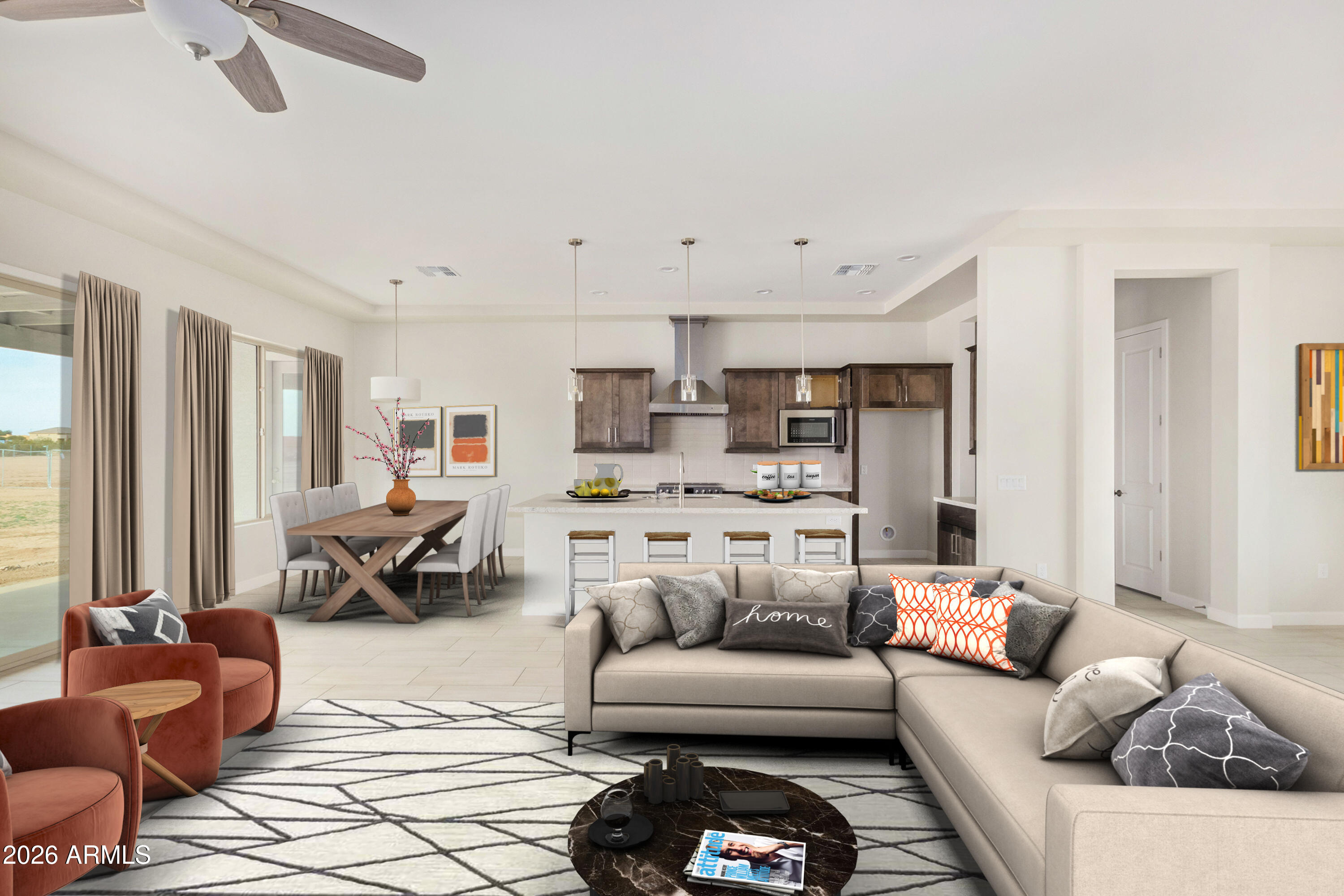 This beautiful home is situated on an acre and on a quiet road with NO HOA! Block Fencing, Quartz counter tops, large center island, tile backsplash, built-in microwave, stainless steel hood, upgraded lighting, designer tile, his and hers walk-in closets in primary bedroom. 8' doors 10' ceilings, split floor plan 4 bedroom 2 bath 3 car garage! Located in a very nice area for riding UTV's and horses and only minutes from Surprise and Wickenburg.